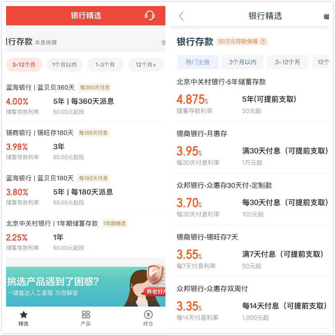据了解,通过平台销售的存款产品,全部为个人定期存款,以3年、5年期为主,3年期利率最高为4.125%、5年期4.875%,均已接近或达到全国自律定价机制上限。近半数产品的起存金额仅50元,且均可提前随时支取。